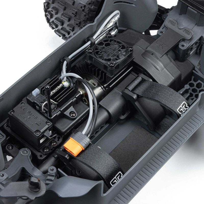 A eletrónica Spektrum, de alta qualidade e à prova de água, está instalada para que não tenha de se preocupar com nada em quaisquer condições. O variador/recetor SLT 2 em 1 40A está preparado para LiPo. Para uma direção precisa, a ARRMA inclui um potente servo digital de engrenagem metálica S661 que produz 125 oz-in de binário a 6V.